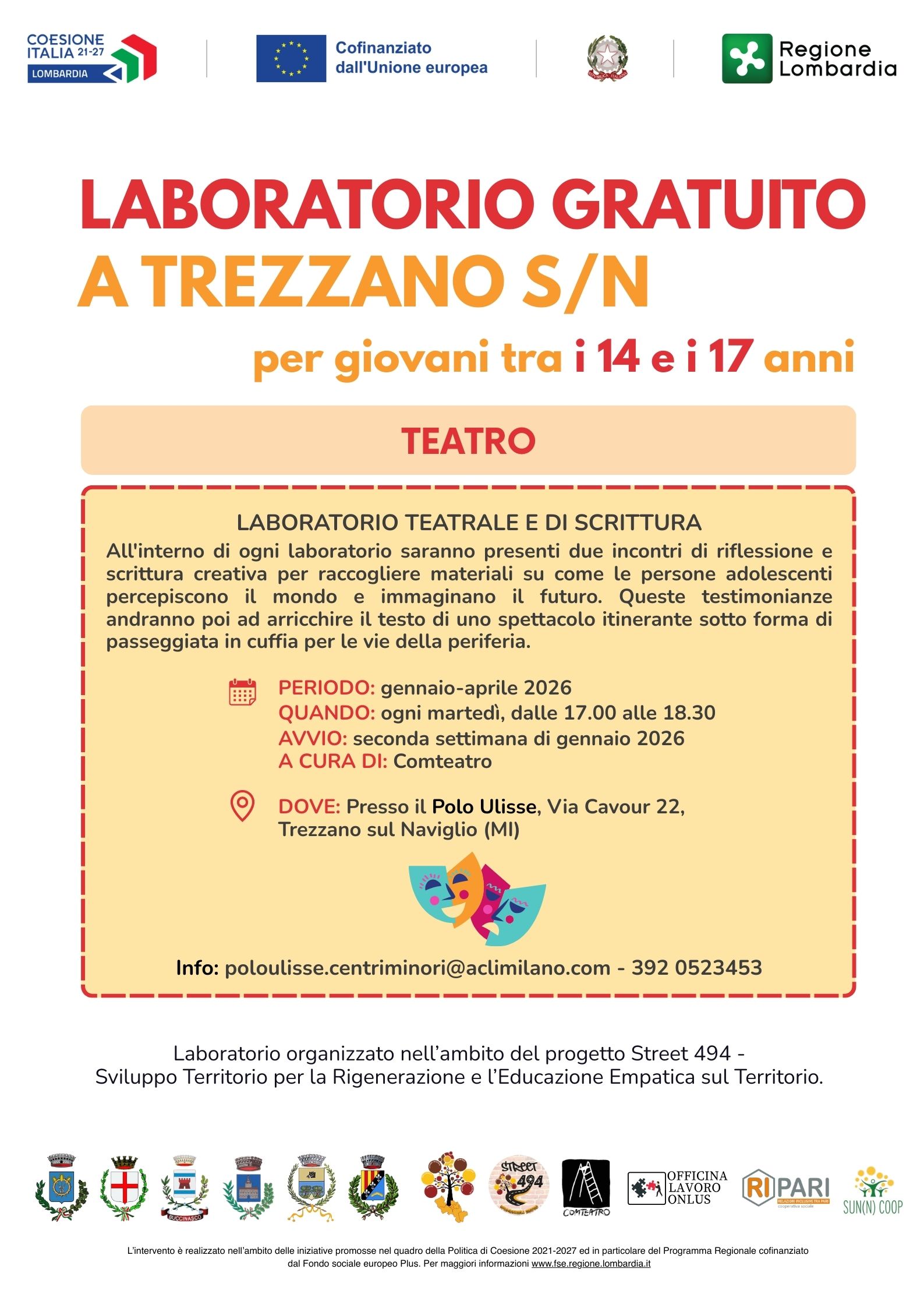 Nell'ambito del progetto Street 494 è stato sviluppato un laboratorio interamente gratuito di TEATRO per giovani tra i 14 e i 17 anni. Tutte le informazioni utili si trovano nella locandina sottostante: