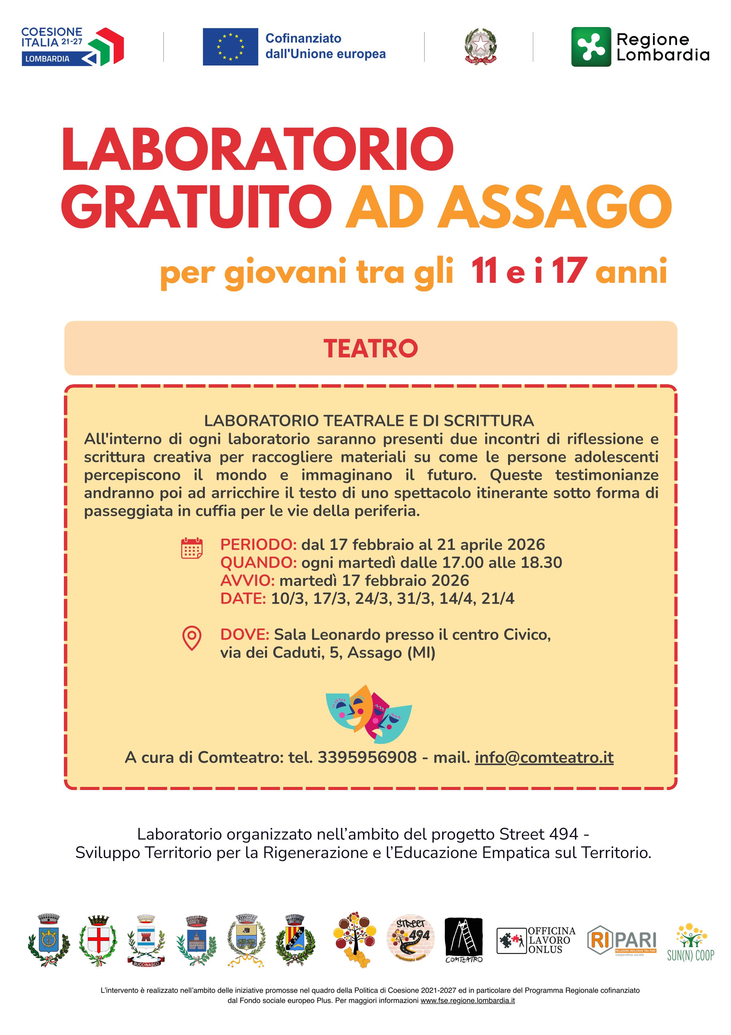 Nell'ambito del progetto Street 494 è stato sviluppato un laboratorio interamente gratuito di TEATRO per giovani tra gli 11 e i 17 anni. Tutte le informazioni utili si trovano nella locandina sottostante:
