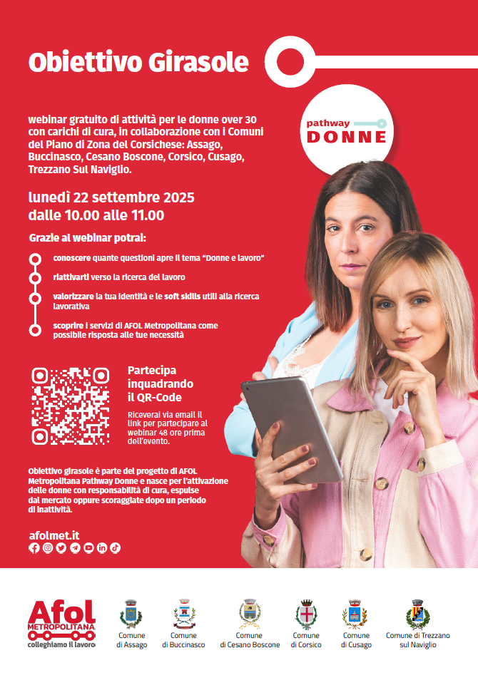 Webinar gratuito di attività per le donne over 30 con carichi di cura, in collaborazione con i Comuni del Piano di Zona del Corsichese:  Assago, Buccinasco, Cesano Boscone, Corsico, Cusago, Trezzano Sul Naviglio.